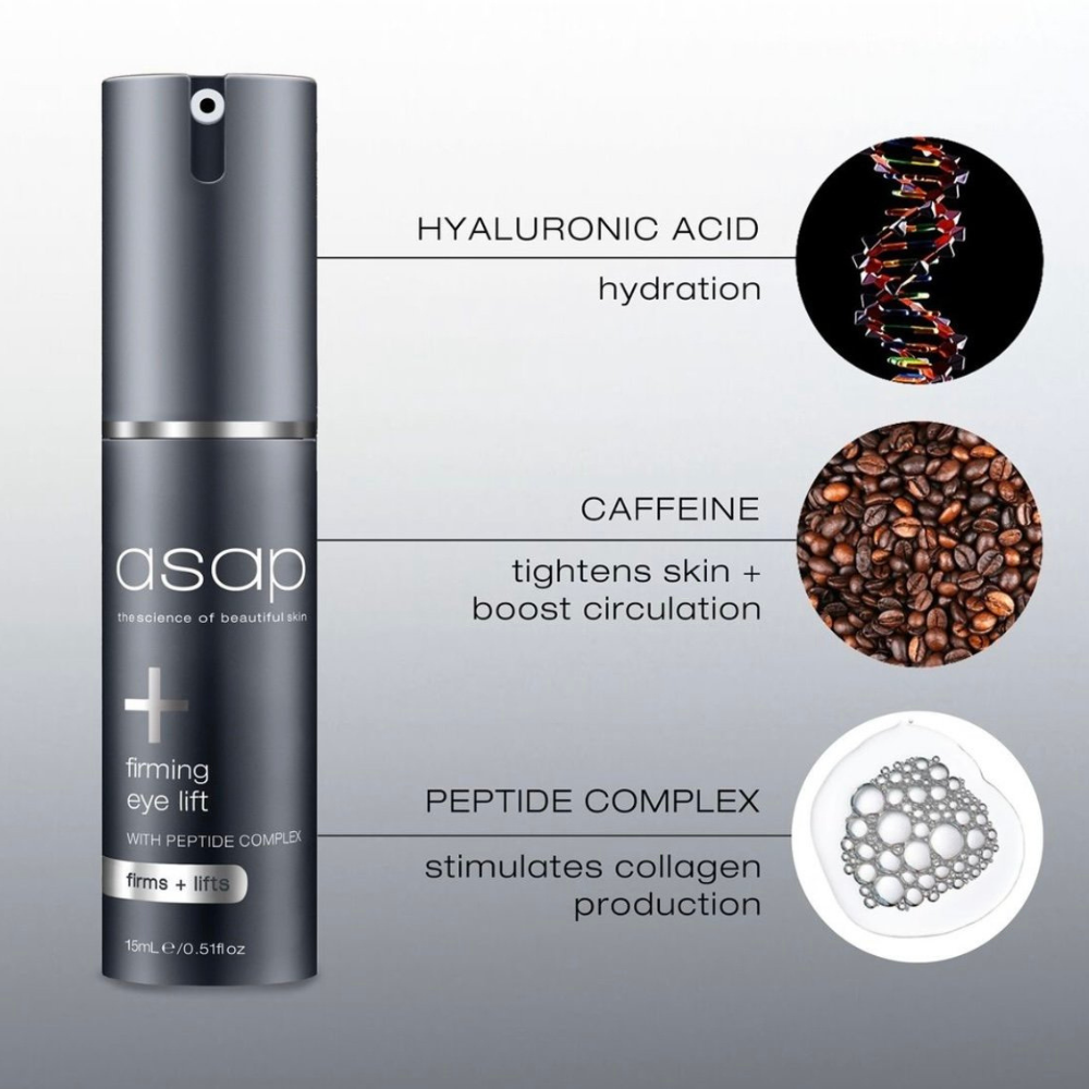 Introducing Asap Firming Eye Lift, a cutting-edge eye serum that promises to redefine the way you care for the delicate skin around your eyes. Utilising state-of-the-art multi-peptide technology, this serum delivers a potent blend of ingredients designed to visibly firm, lift, and smooth the eye area.