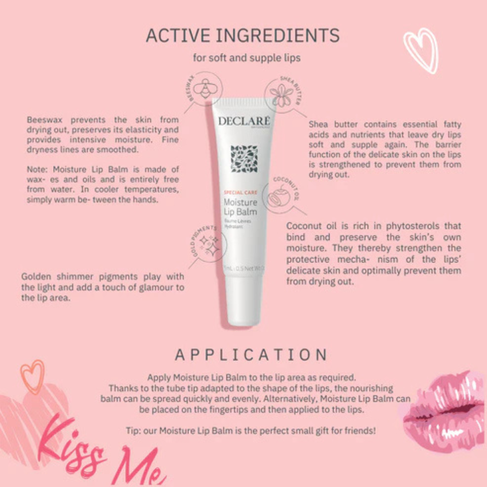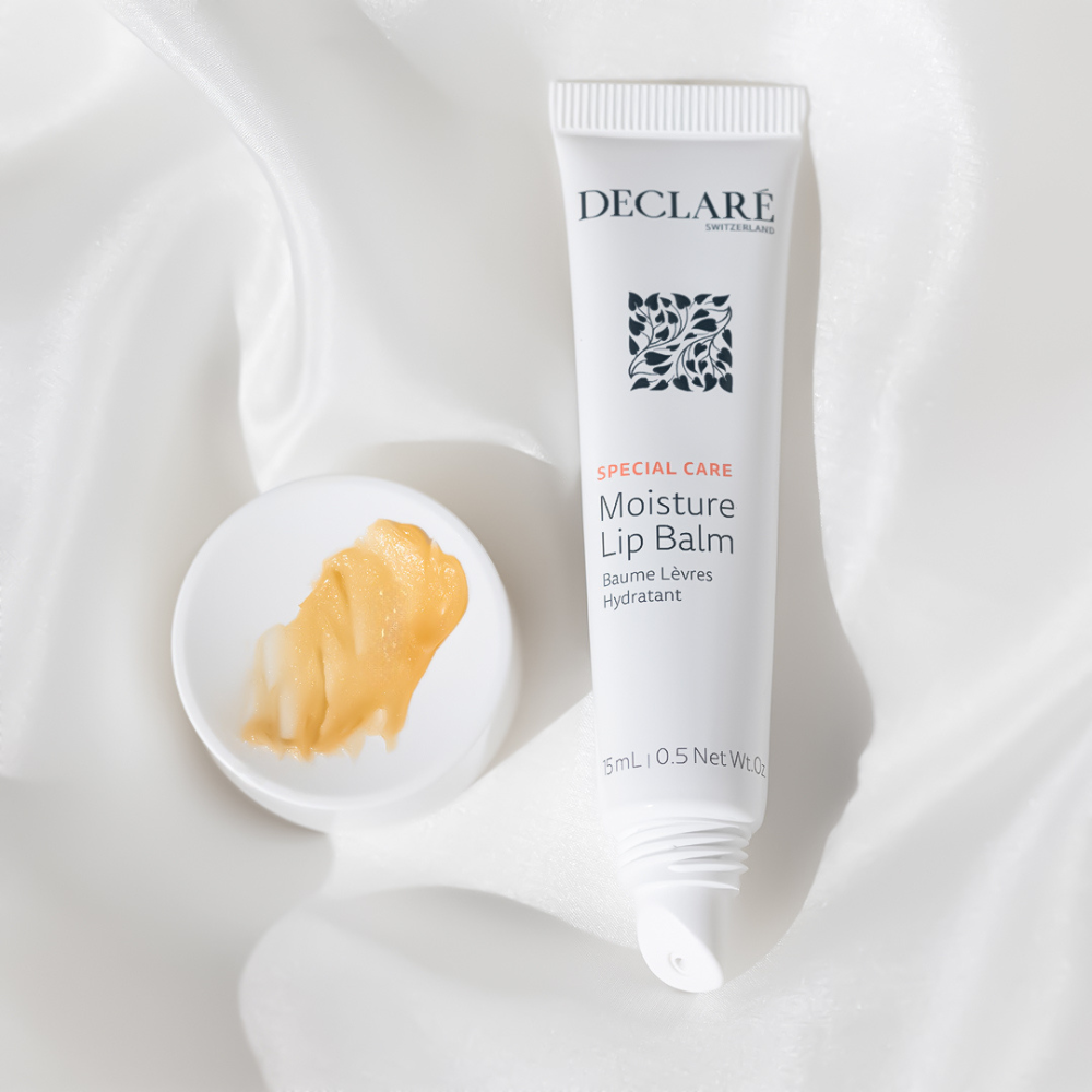 - Apply Declare Special Care Moisture Lip Balm directly to lips as needed throughout the day.