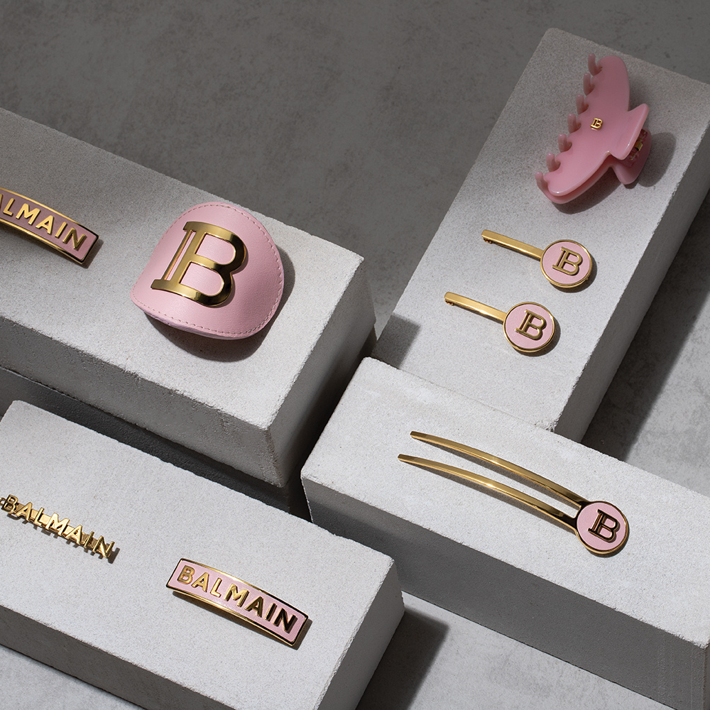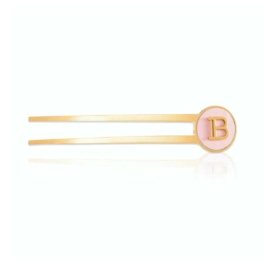 The Limited Edition Fourche is inspired by the design of the newly updated Balmain Logo. This exclusive hair accessory adds a stylish finish to any look, with its pink Napa leather design making it a true summer statement piece.
