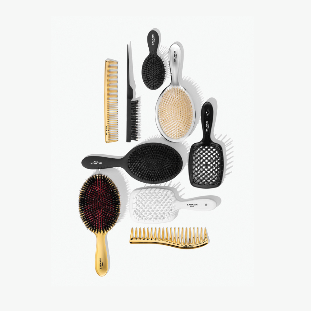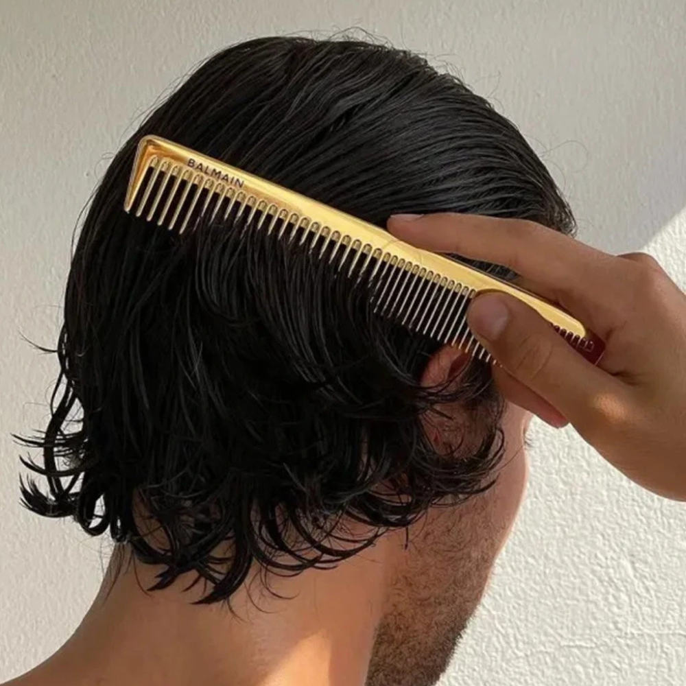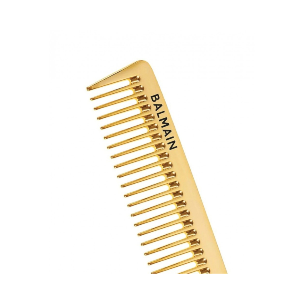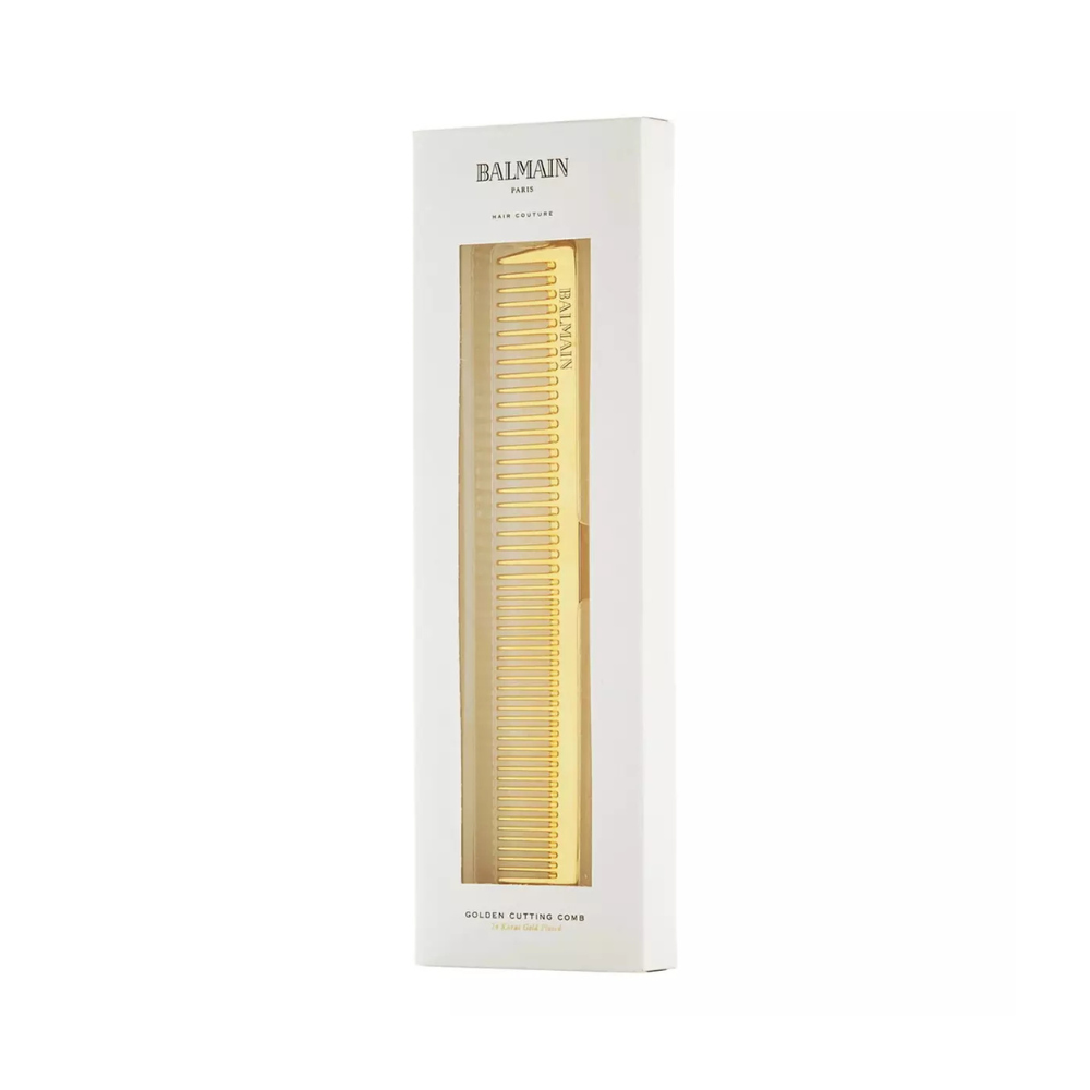 The Balmain Golden Cutting Comb is a luxurious tribute to the artistry of hairdressing. This limited edition professional cutting comb is expertly crafted with 14K gold-plating, offering both opulence and functionality. Meticulously designed with rounded teeth to prevent scalp irritation, this premium tool meets the highest quality standards in both materials and craftsmanship.