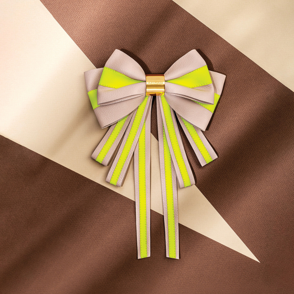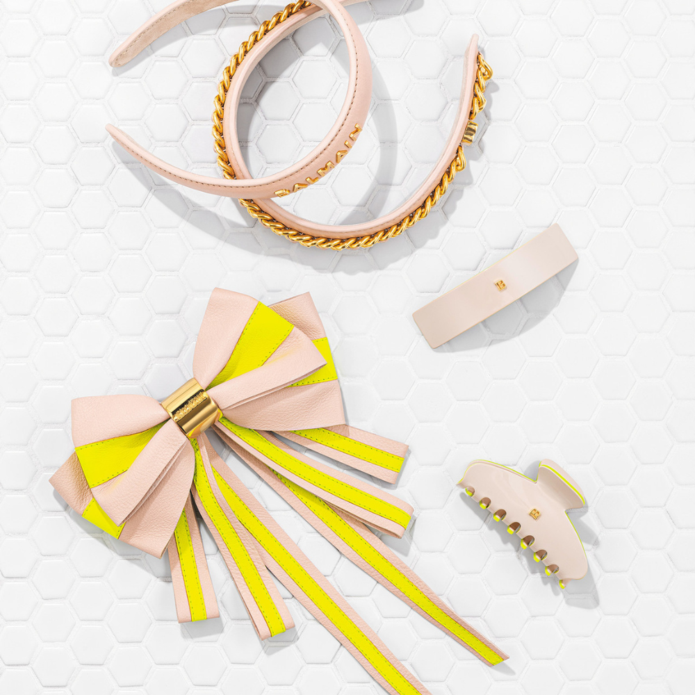 The Limited Edition Leather Bow Barrette is a perfect statement hairpiece that combines new-age looks with a classic Balmain feel. This distinctive accessory features striking neon accents and an elegant 18K gold-plated logo plate with an engraved Balmain logo.