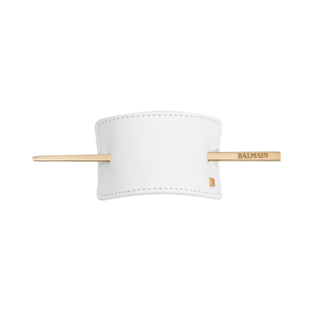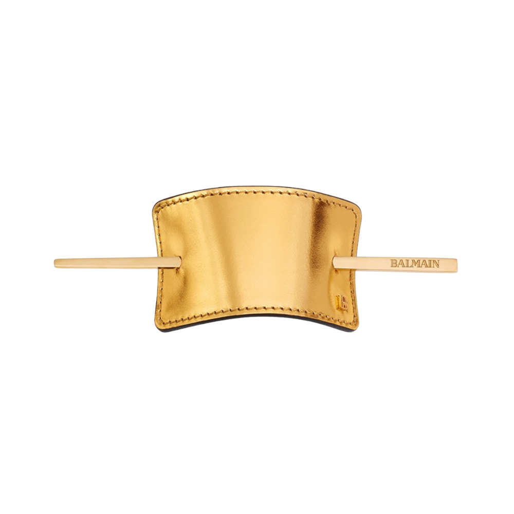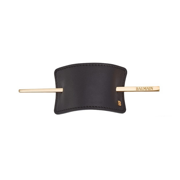 The Balmain Luxury Hair Barrette Leather combines timeless elegance with premium craftsmanship. Made from genuine suede and napa leather, this sophisticated hair accessory is designed with a 14k gold-plated hairpin featuring an engraved Balmain logo, adding a touch of luxury to any hairstyle.