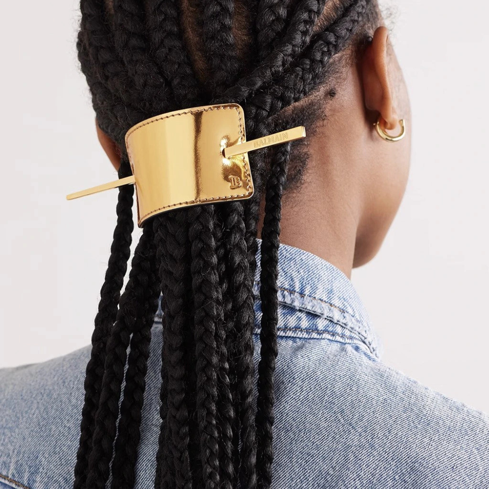 - Iconic Balmain Ponytail: Comb your hair to the back and make a ponytail. Take the elastic and put it an extra turn around the ponytail. Take the Hair Barrette and pin it across the scalp. Use it as a finish for updo's. Comb the hair to the back and make a ponytail. Use Styling Gel Strong or Silk Perfume to create a high gloss finish. Place the Hair Barrette over the elastic and secure with the 14k gold-plated hairpin.