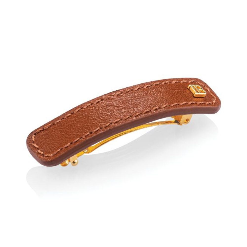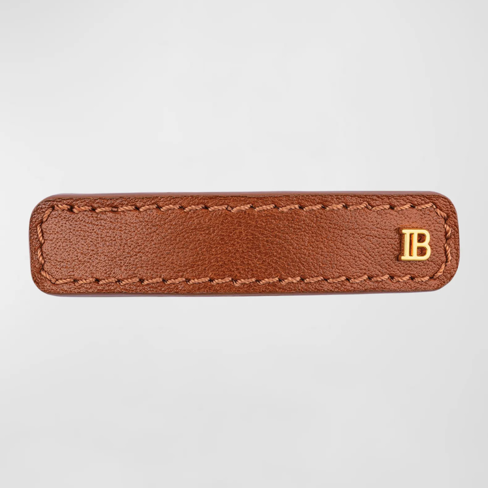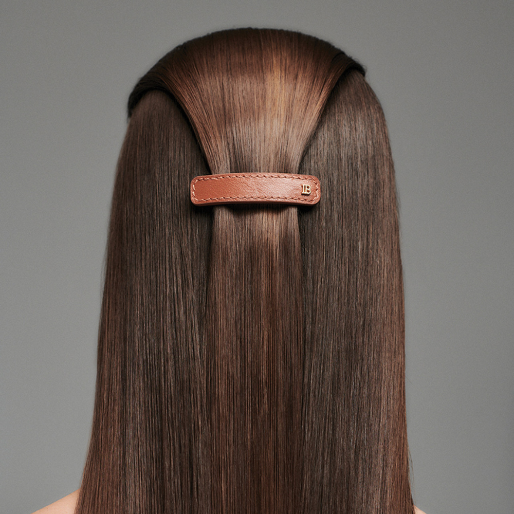 The Balmain Luxury Leather Barrette Medium combines practicality with haute couture design principles. This medium-sized genuine leather accessory features rich cognac tones that complement a wide range of hair colours, making it an essential addition to your styling collection.