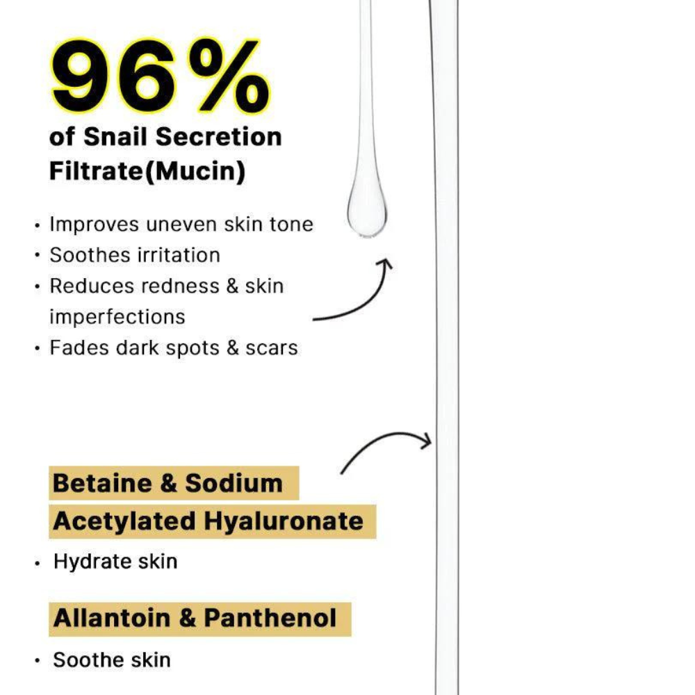 Snail Secretion Filtrate, Betaine, Butylene Glycol, 1,2-Hexanediol, Sodium Polyacrylate, Phenoxyethanol, Sodium Hyaluronate, Allantoin, Ethyl Hexanediol, Carbomer, Panthenol, Arginine.