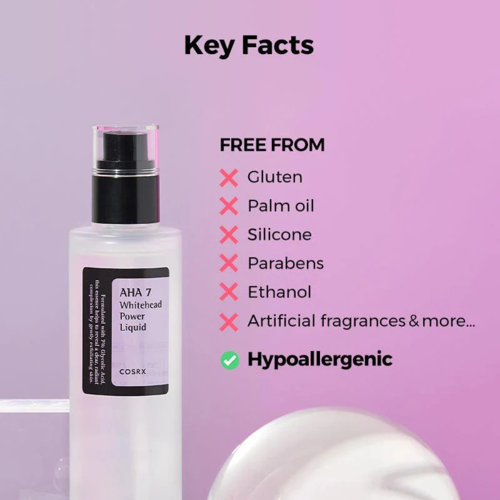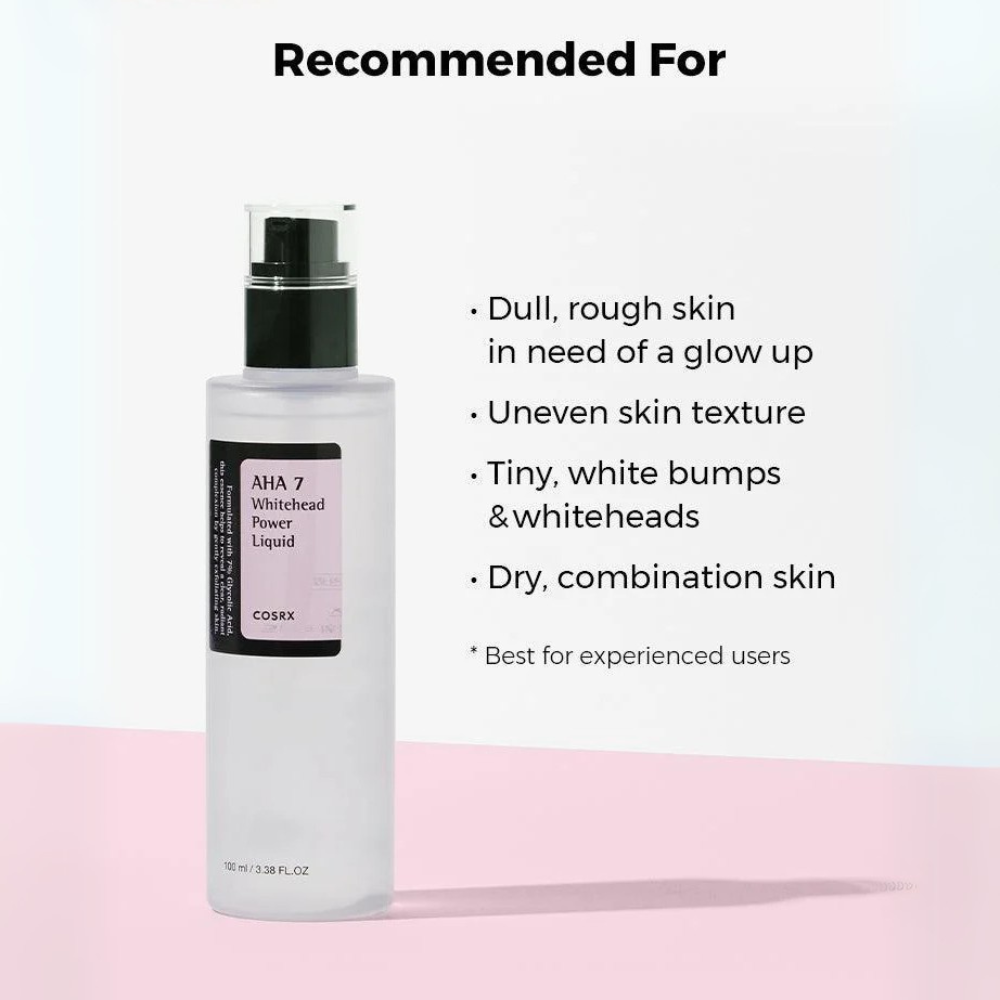 COSRX AHA 7 Whitehead Power Liquid is a potent exfoliating treatment that harnesses the power of Glycolic Acid to effectively target whiteheads and uneven skin texture.