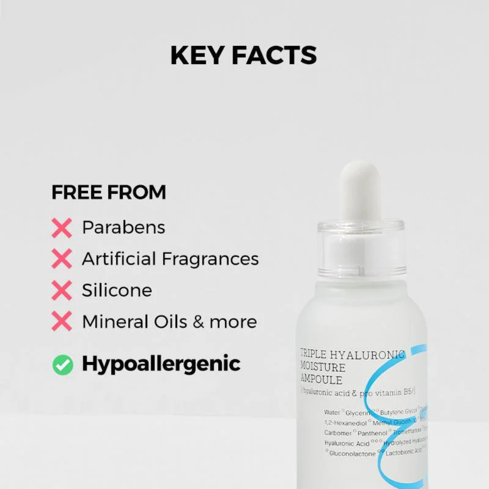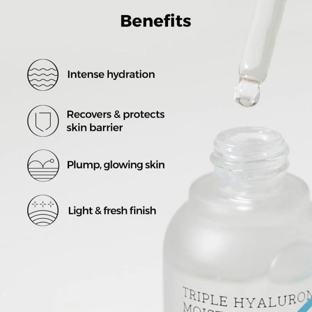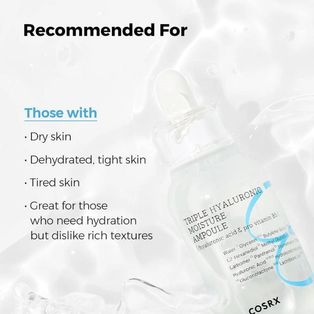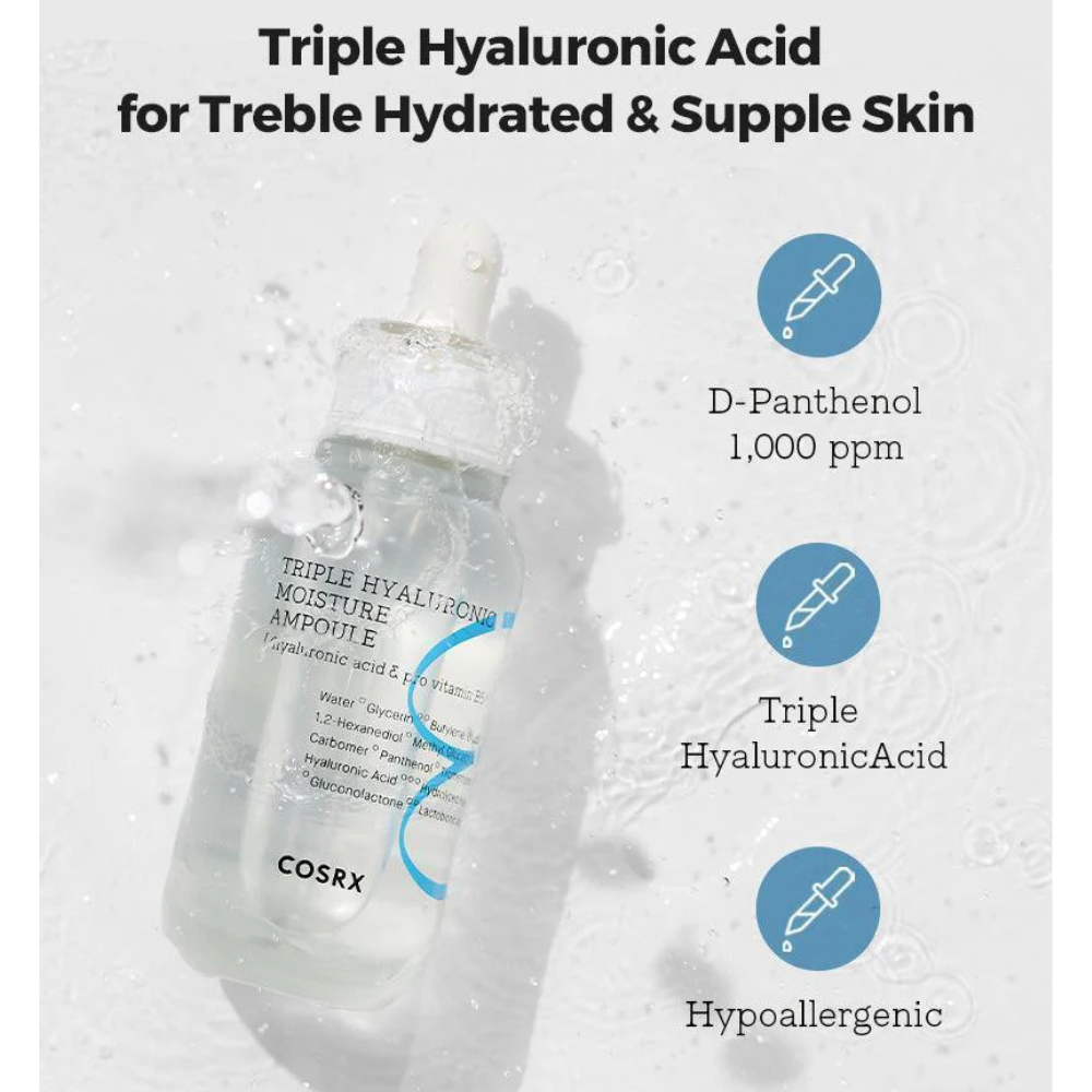 COSRX Hydrium Triple Hyaluronic Moisture Ampoule is a concentrated hydrating treatment that combines three forms of Hyaluronic Acid for maximum moisture retention.