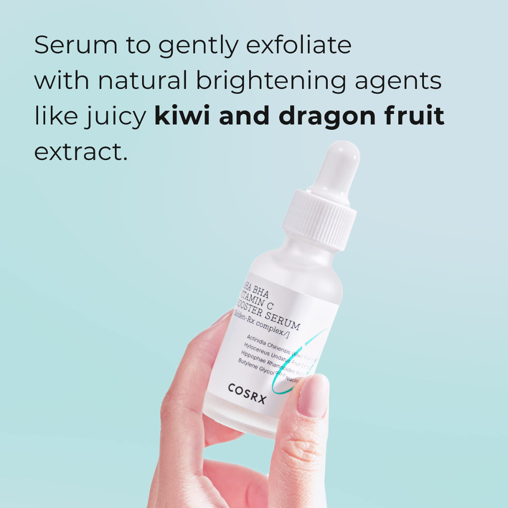 COSRX Refresh AHA BHA Vitamin C Booster Serum harnesses the power of natural fruit extracts from kiwi and dragon fruit, alongside a potent blend of active ingredients to gently resurface and brighten the complexion.