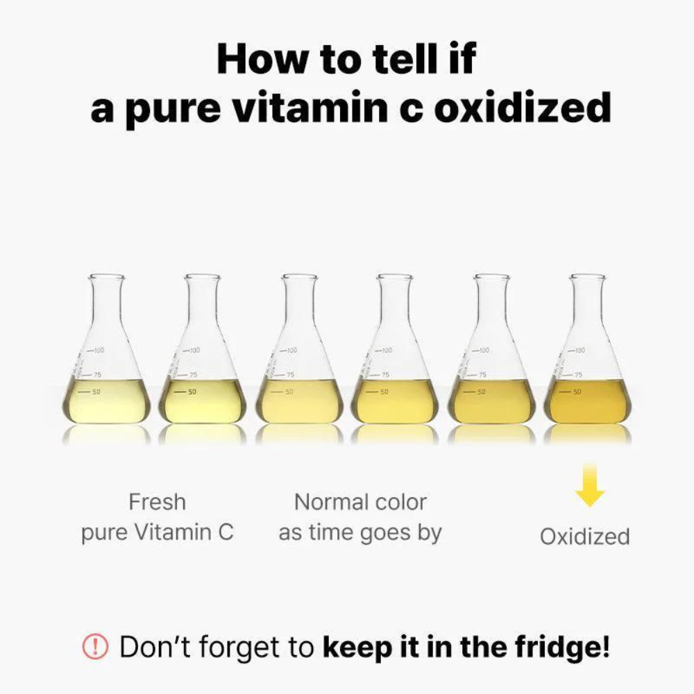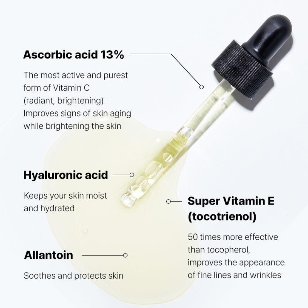 Water, Ascorbic Acid (13%), Butylene Glycol, Dipropylene Glycol, Tromethamine, 3-O-Ethyl Ascorbic Acid, Panthenol, Acetyl Glucosamine, Caffeine, Sodium Hyaluronate, Sodium Sulfite, Disodium EDTA, Glutathione, Adenosine, Gardenia Florida Fruit Extract, Allantoin, Dextrin, Squalane, Tocotrienols, Tocopherol, Elaeis Guineensis (Palm) Oil, Arginine, Niacinamide, Pentylene Glycol, Glycyrrhiza Glabra (Licorice) Root Extract.