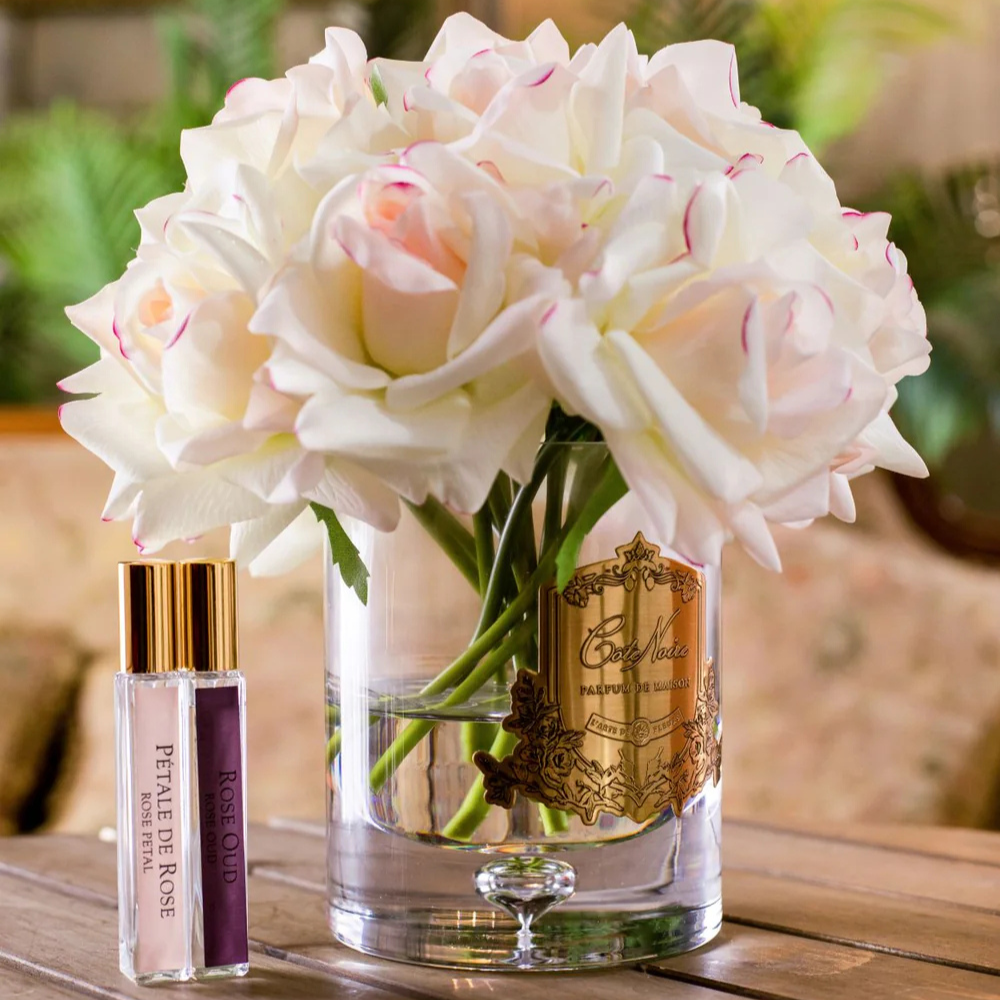Handcrafted Rose Buds With Natural Coating, Special Gel Formula, Rose Oud Perfume (10ml), Charente Rose Perfume (10ml), Hand-Blown Glass Vessel.