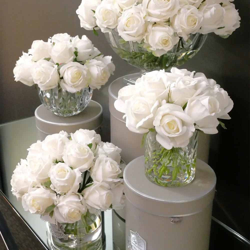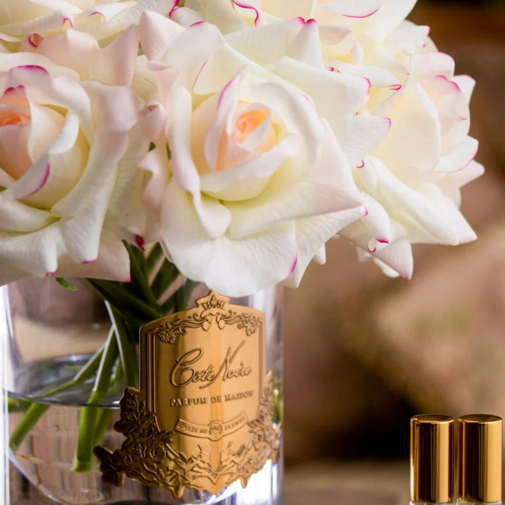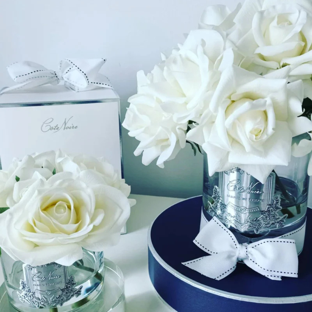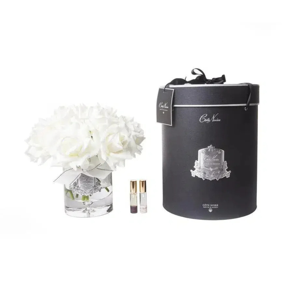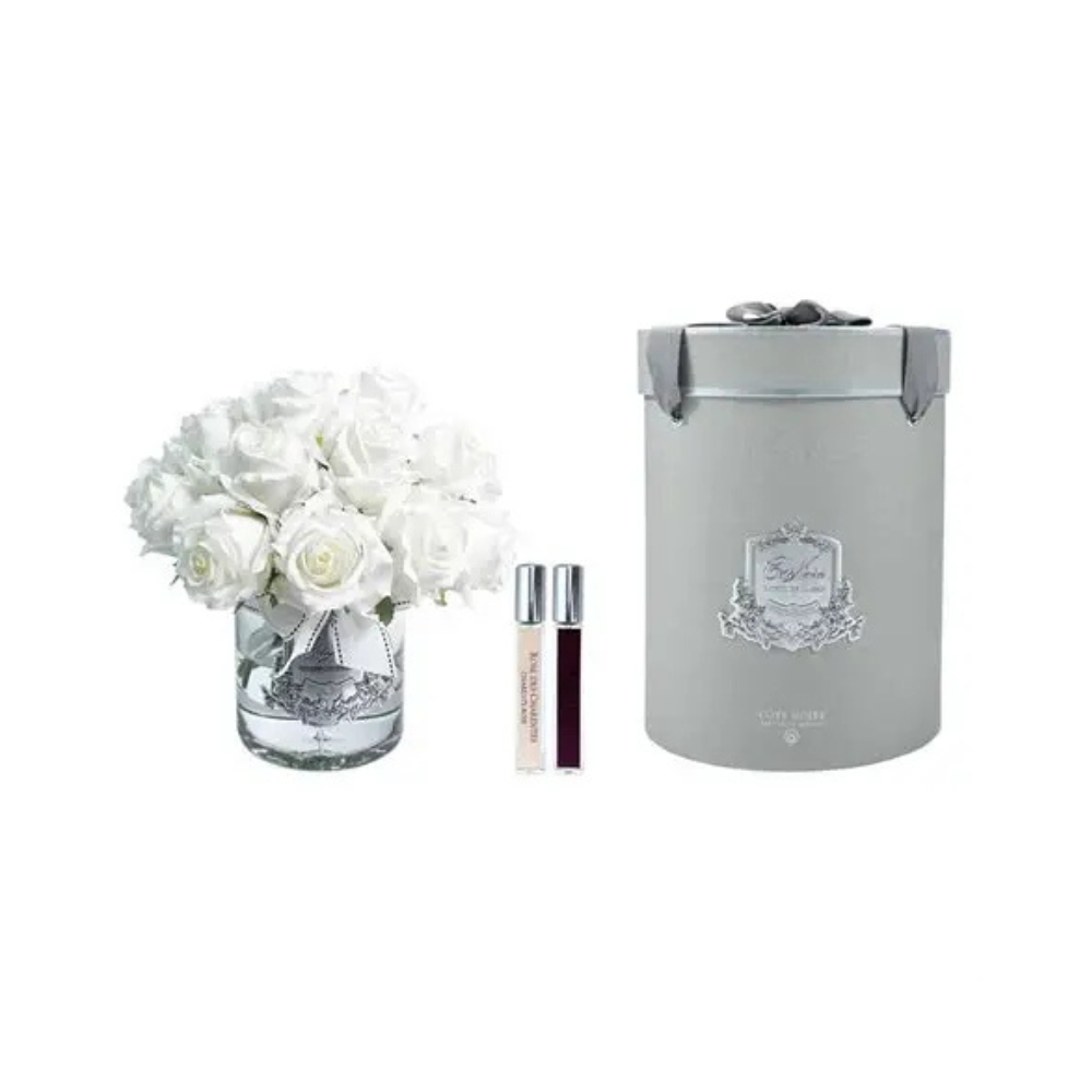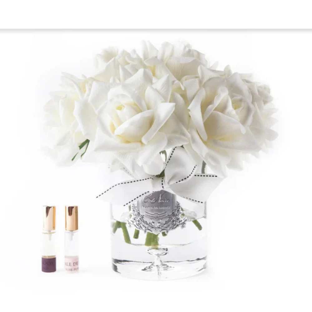 Each life-like perfumed Luxury Grand Bouquet has been skillfully hand crafted and is set in gel giving it the appearance of water. Each petal has a special natural coating to give them a true to life touch & appearance. Thirteen roses have been arranged in a luxury vase with a gold Cote Noire signature badge.