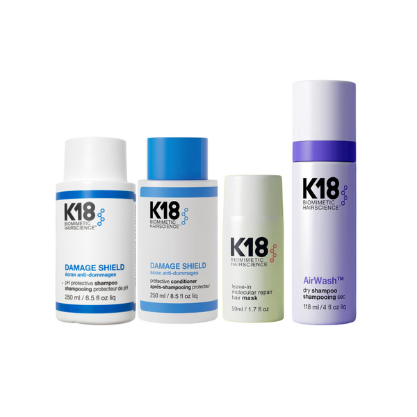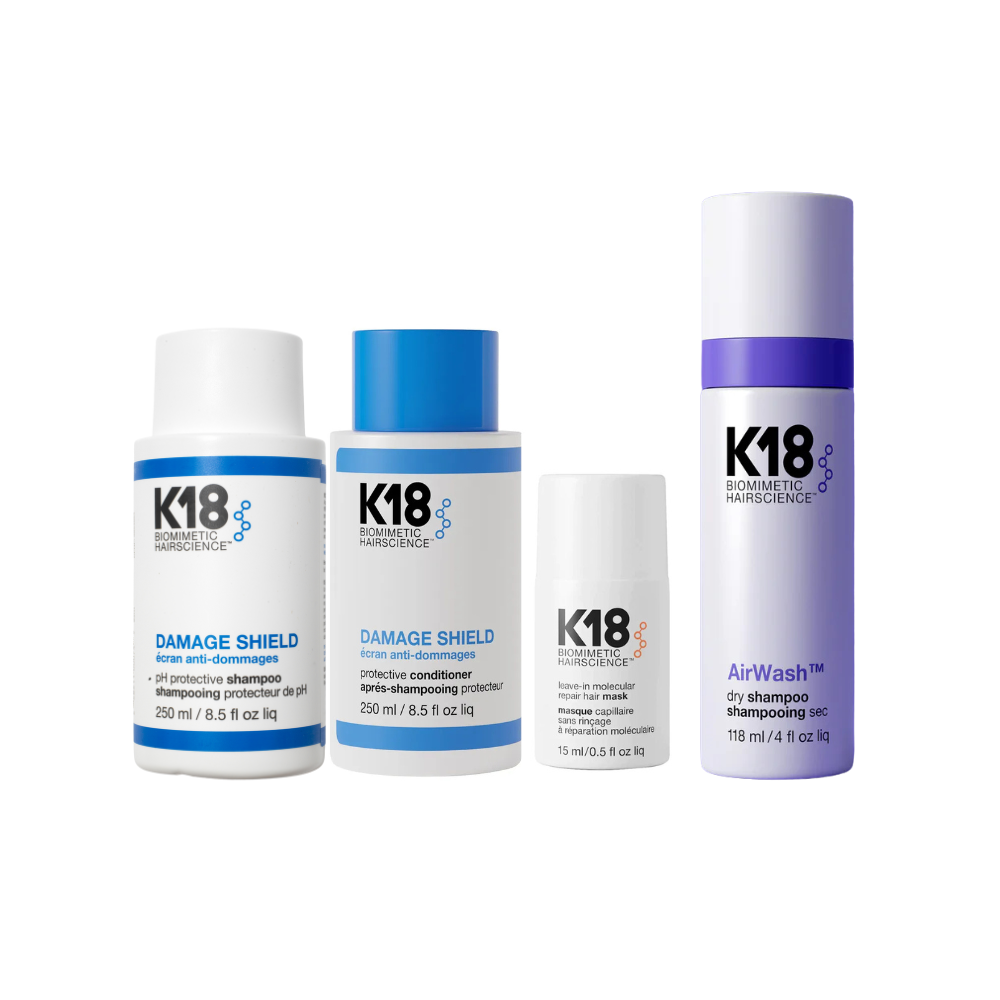 - Begin with K18 Damage Shield pH Protective Shampoo, massage into wet hair and scalp, then rinse thoroughly.