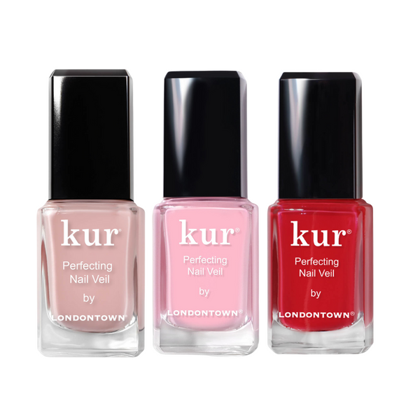 Introducing the Londontown kur Nail Veil Trio, a revolutionary approach to nail care that blends subtle colour with intensive conditioning. This trio features three shades: #4 Dusty Rose, #7 Blossom Cherry, and #8 Poppy Red, each presented in a 12ml bottle.