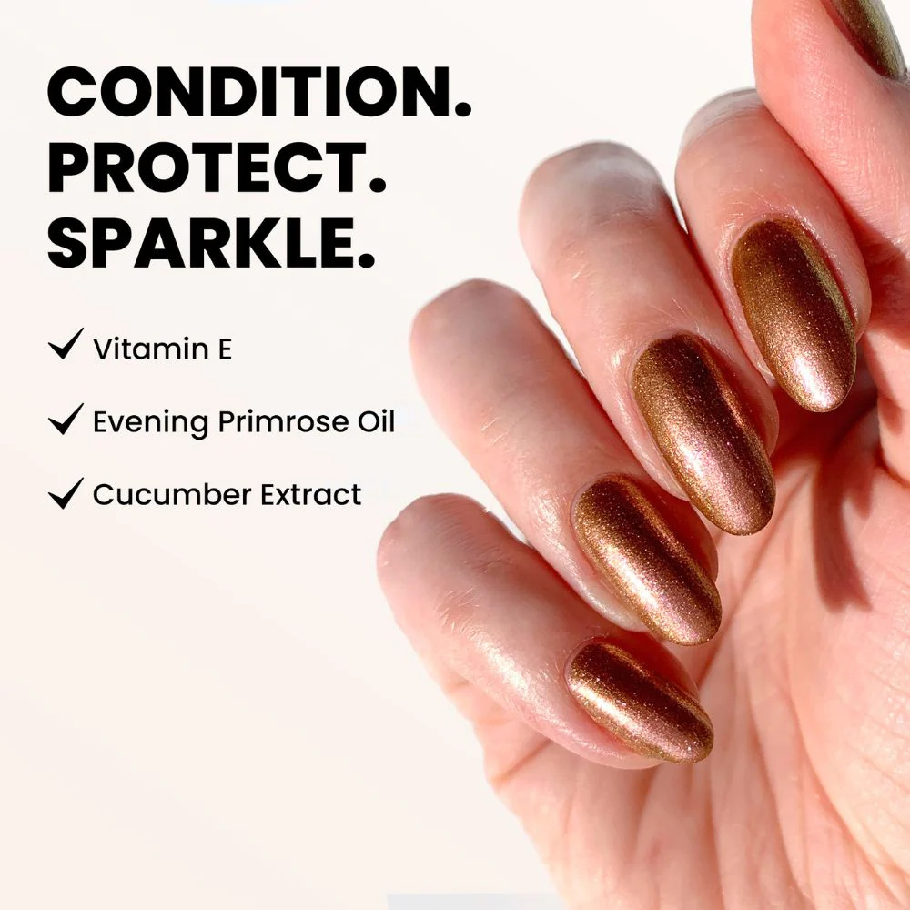 A shimmering shield that combines antioxidant-enriched shine with the resilience of a protective barrier. Inspired by makeup highlighters, this one-step manicure captures the look of that glistening radiance with multi-dimensional Color Traveling Pigments. Four chameleon shades shift at every angle for a most mesmerizing finish, and infused in that dazzling sparkle is conditioning nail care—which works to optimize your nail’s outer defense against damaging environmental stressors.