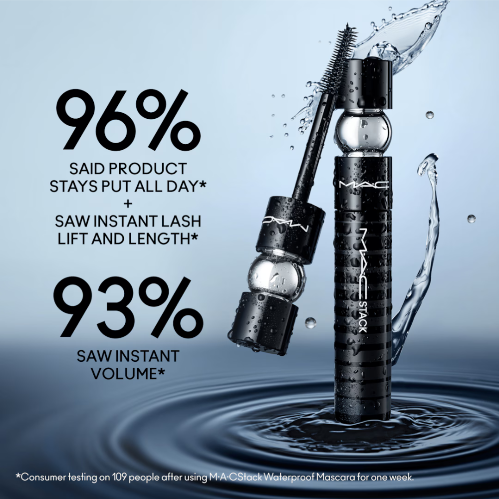 M.A.C M·A·CStack Waterproof Mascara revolutionises lash enhancement with its innovative, continuously buildable formula. This award-winning mascara combines gravity-defying volume with instant lift and length, all while maintaining a clump-resistant finish. The breakthrough Drench-Defense Technology wraps each individual lash, creating a protective barrier that repels water for true 24-hour waterproof and smudge-proof wear.