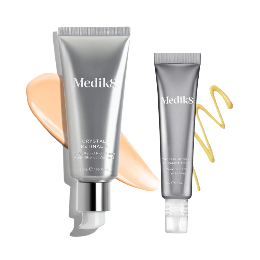 Elevate your anti-ageing skincare routine with the Medik8 Crystal Retinal Face & Eye Set. This duo harnesses the power of retinal, a next-generation form of vitamin A that works up to 11 times faster than traditional retinol.