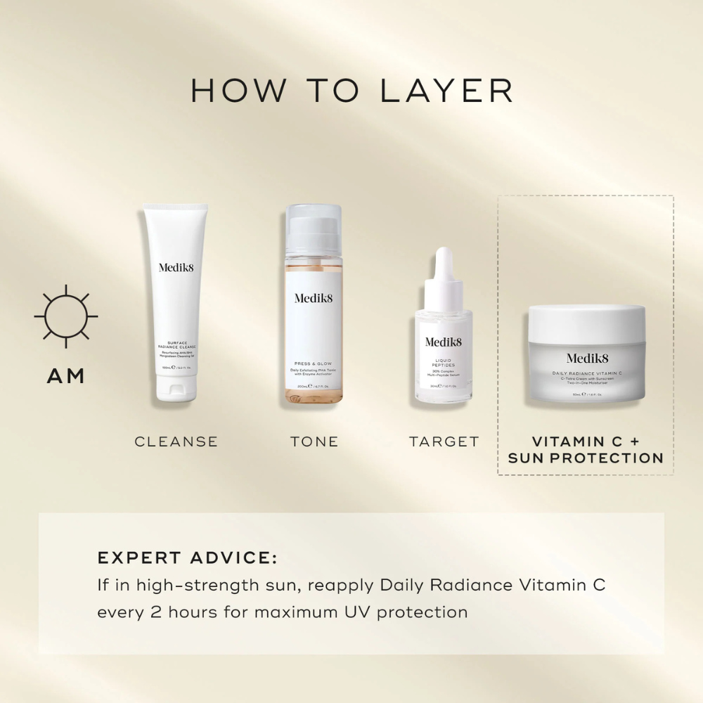 SkiTransform your skincare routine with the Medik8 Luminous Lift Gift Pack. This powerful duo combines Press & Glow, a gentle exfoliating toner that removes dead surface cells, with Liquid Peptides, an advanced anti-ageing serum.