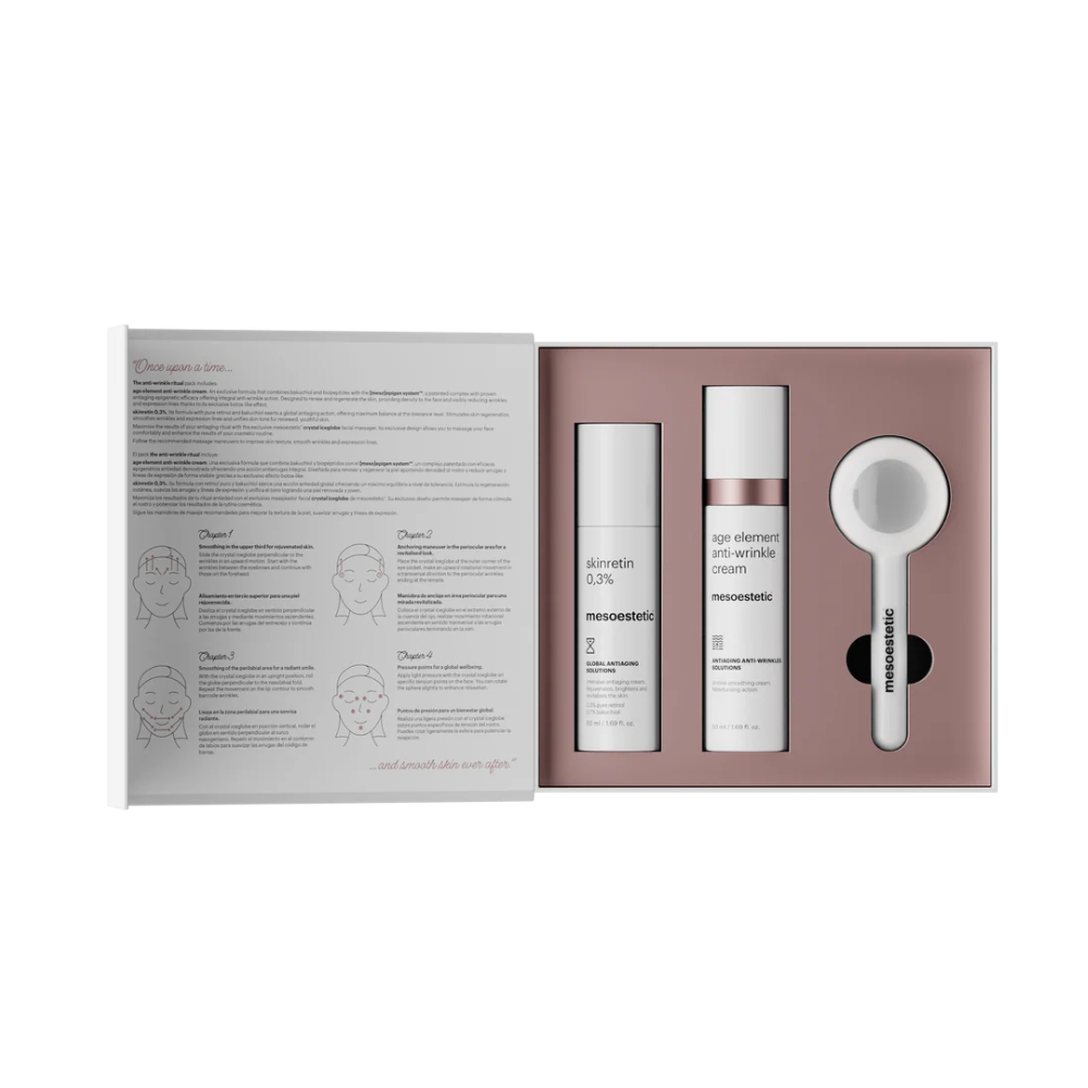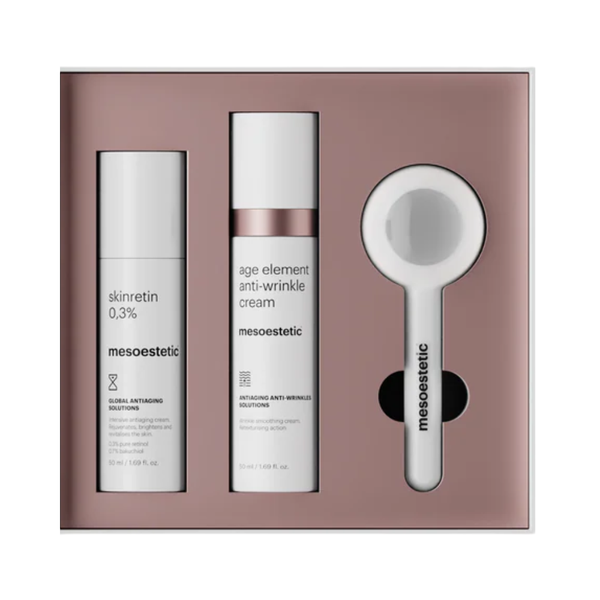 The Mesoestetic Anti-Wrinkle Ritual Pack is a targeted anti-ageing routine designed to smooth, firm, and revitalise skin. This limited-edition set includes the age element® Anti-Wrinkle Cream for daily wrinkle correction, Skinretin 0.03% for intensive night renewal, and an exclusive Ice Globe Facial Massager to enhance results. Together, they work to reduce visible fine lines, restore skin elasticity, and leave the complexion brighter and more even.