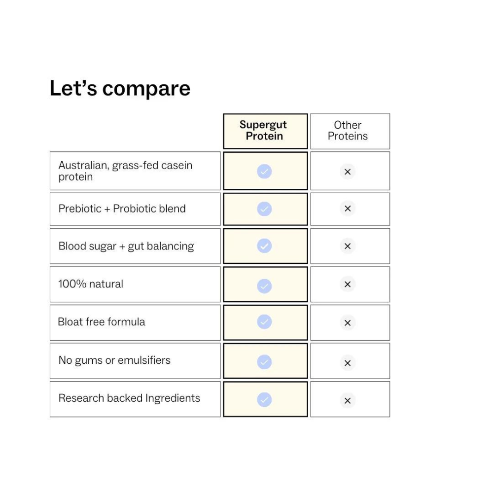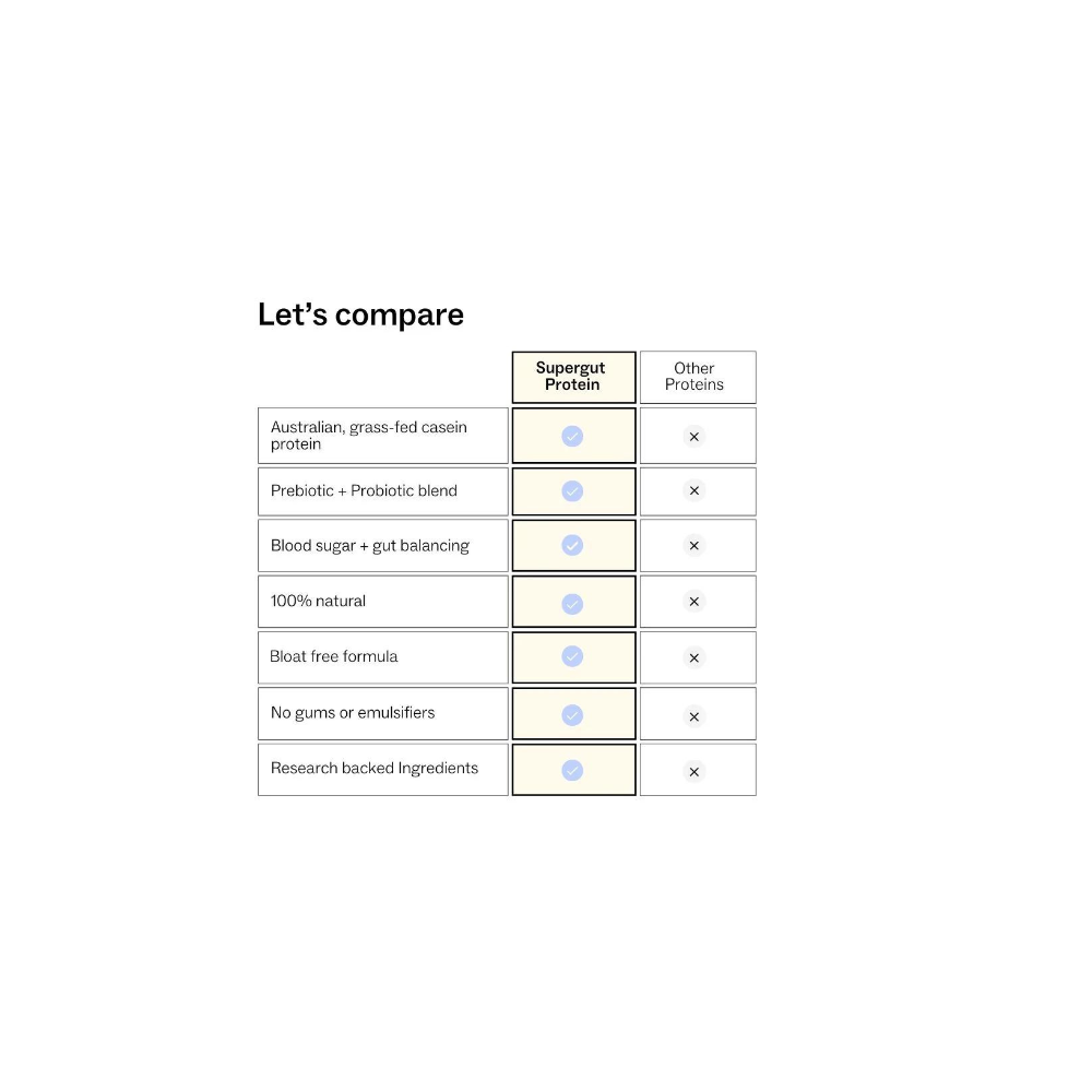 my way up Supergut Protein uses Australian grass-fed casein protein, which is a slow-releasing protein that provides sustained amino acid delivery to muscles and promotes greater satiety.