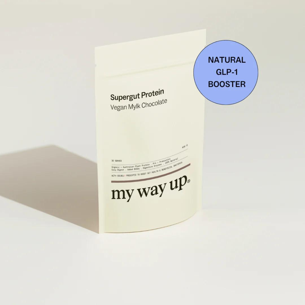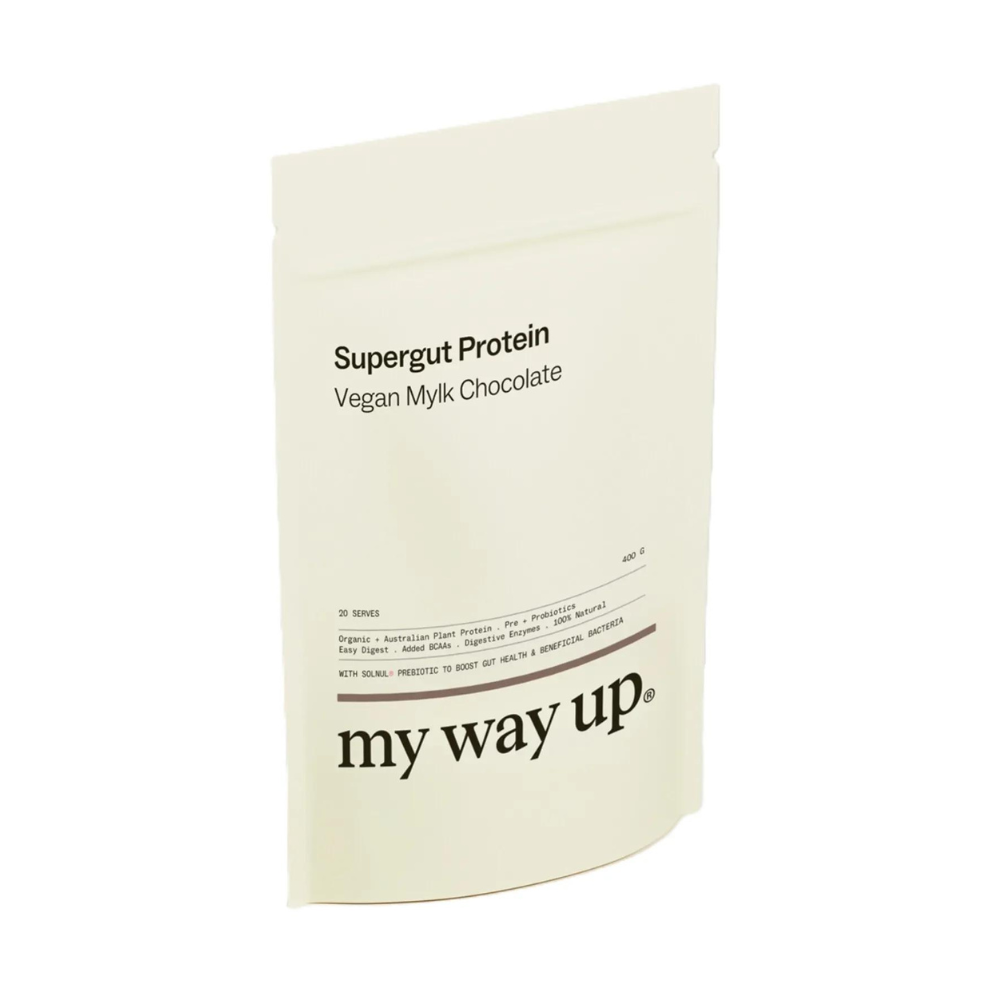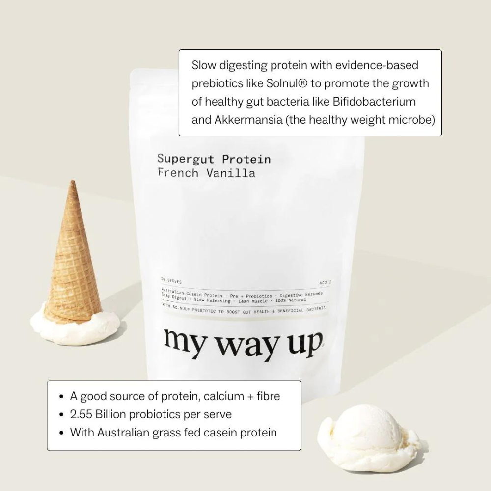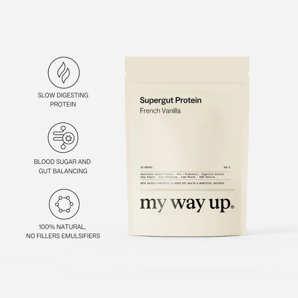 my way up Supergut Protein is a revolutionary protein supplement designed to keep you fuller for longer while supporting optimal gut health. This super clean, slow-digesting formula features fresh Australian-sourced protein combined with a blood sugar balancing blend of prebiotics, including the clinically studied Solnul®.