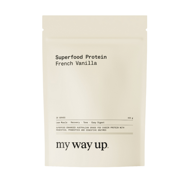 Unlike standard protein powders, my way up Supergut Protein focuses on both protein supplementation and gut health. It contains slow-releasing Australian casein protein, prebiotics, probiotics, and digestive enzymes to support better digestion, blood sugar balance, and a healthier gut microbiome.