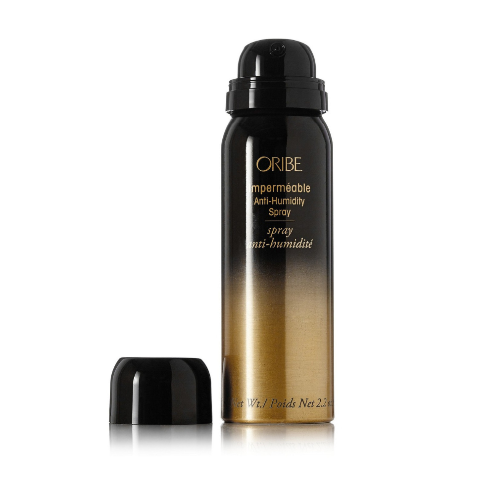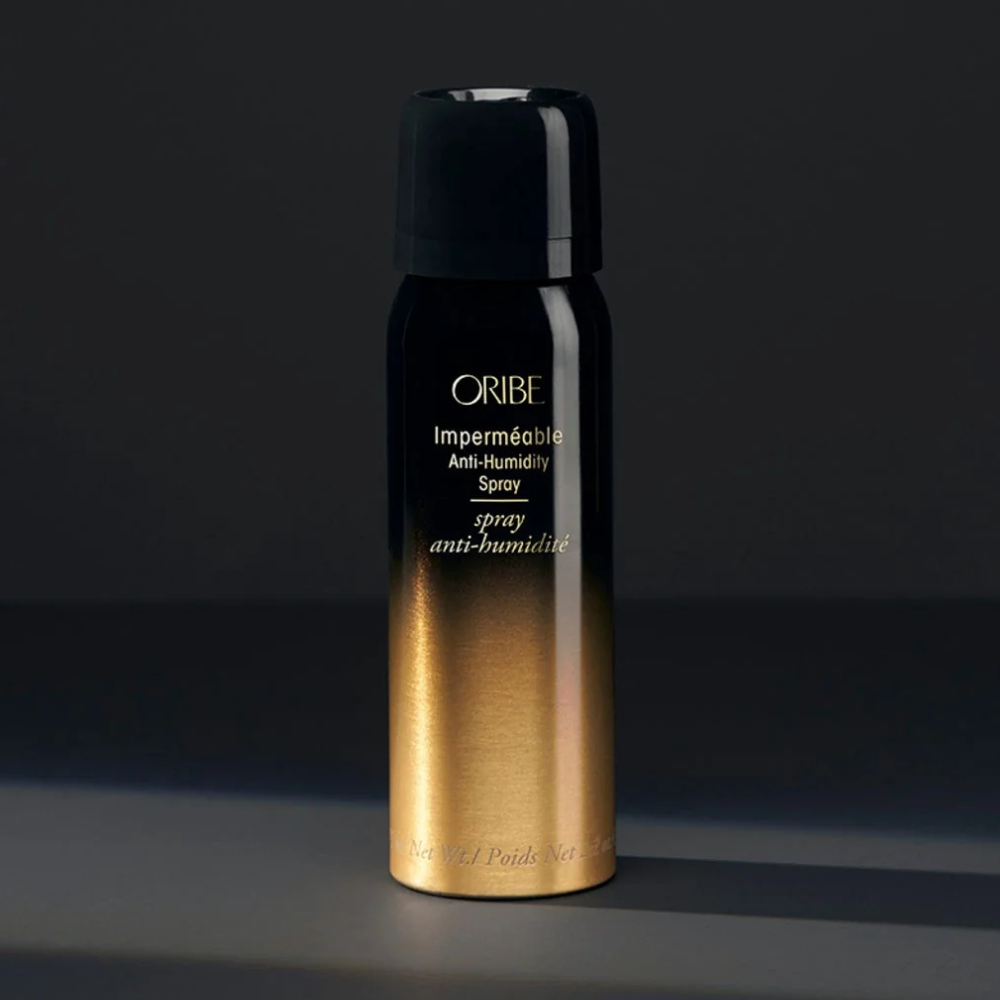 1. Spray Oribe Impermeable Anti-Humidity Spray on finished hair to block frizz, set style, and add texture.