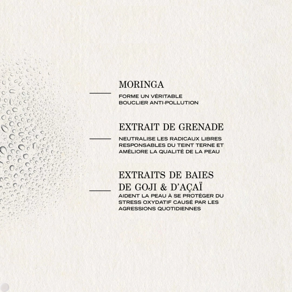 Payot My Payot Anti-Pollution Radiance Mist is an innovative hydrating spray formulated with 99% natural origin ingredients. This multi-tasking mist combines moringa oil with vitamin C derivative and antioxidant-rich fruits including organic goji berry, açaí, and pomegranate to create an effective shield against daily environmental aggressors.