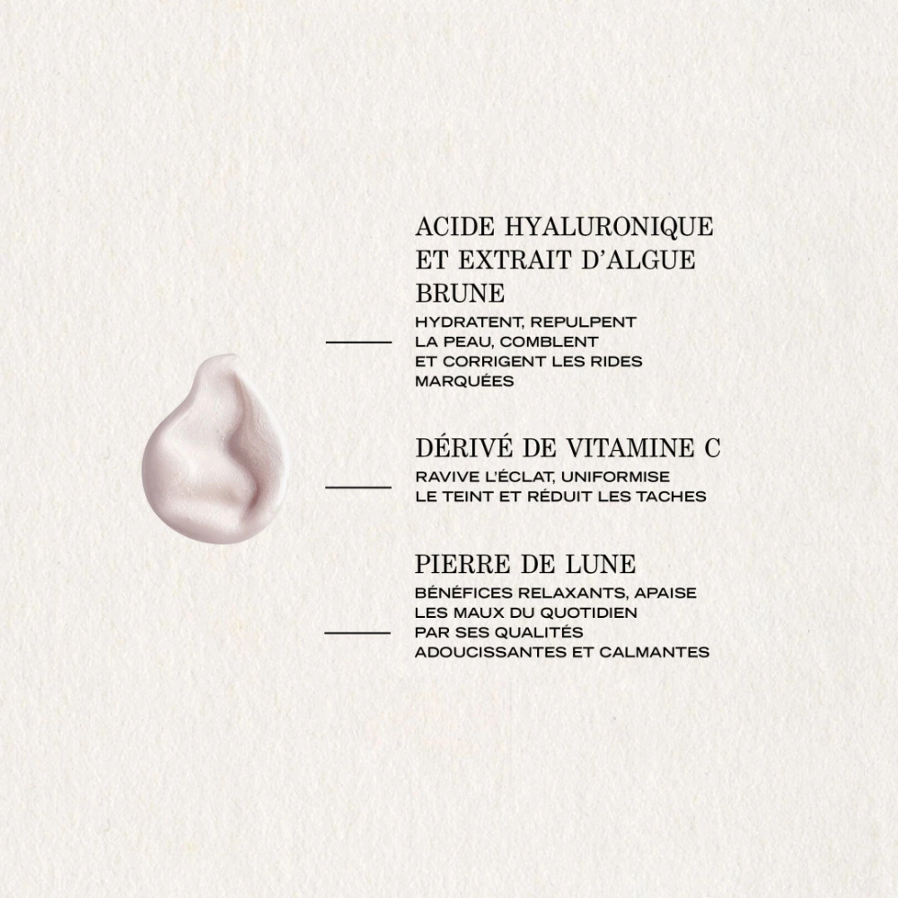 Aqua (Water), Butyrospermum Parkii (Shea) Butter, Dicaprylyl Carbonate, Butylene Glycol, C10-18 Triglycerides, Synthetic Fluorphlogopite, Cetyl Alcohol, Glycerin, Glyceryl Stearate, CI 77891 (Titanium Dioxide), Methylpropanediol, Pentaerythrityl Distearate, Magnolia Officinalis Bark Extract, Alaria Esculenta Extract, Undaria Pinnatifida Extract, Sodium Hyaluronate, Sodium Hyaluronate Crosspolymer, Orchid Extract, Moonstone Extract, Ascorbyl Tetraisopalmitate, Tocopheryl Acetate, Caprylic/Capric Triglyceride, Tocopherol, Mica, Ethylhexyl Stearate, Sorbitan Isostearate, Sodium Isostearate, Silica, Ceteth-20, Steareth-20, Tin Oxide, Polysorbate 60, Decarboxy Carnosine HCL, Polyglyceryl-4 Diisostearate/Polyhydroxystearate/Sebacate, Hydroxyethyl Acrylate/Sodium Acryloyldimethyl Taurate Copolymer, PEG-75 Stearate, Citric Acid, Alcohol, Chlorphenesin, O-Cymen-5-Ol, Sodium Benzoate, Parfum (Fragrance), CI 14700 (Red 4)