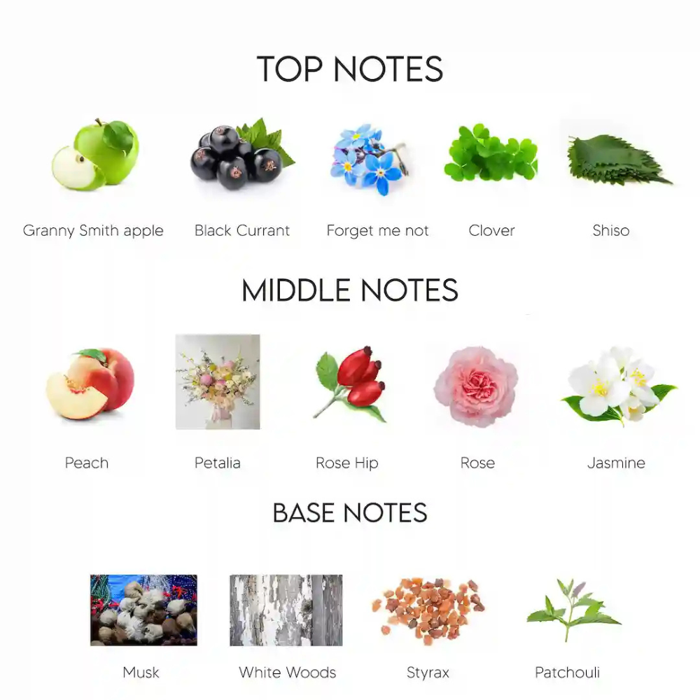 - Top Notes:Blackcurrant, Granny Smith Apple, Clover, Forget-me-not, Shisolia