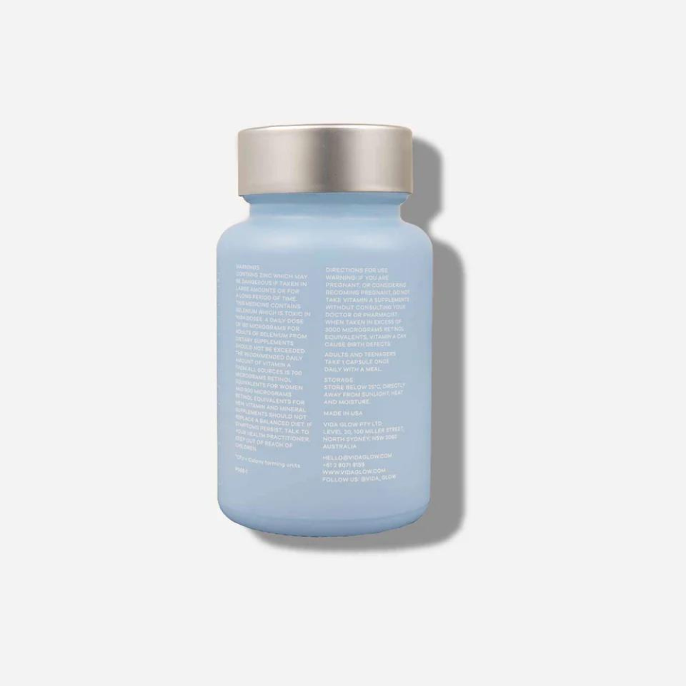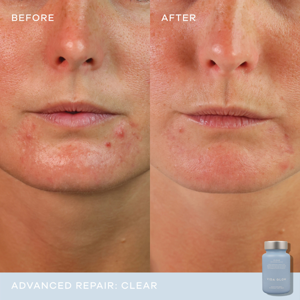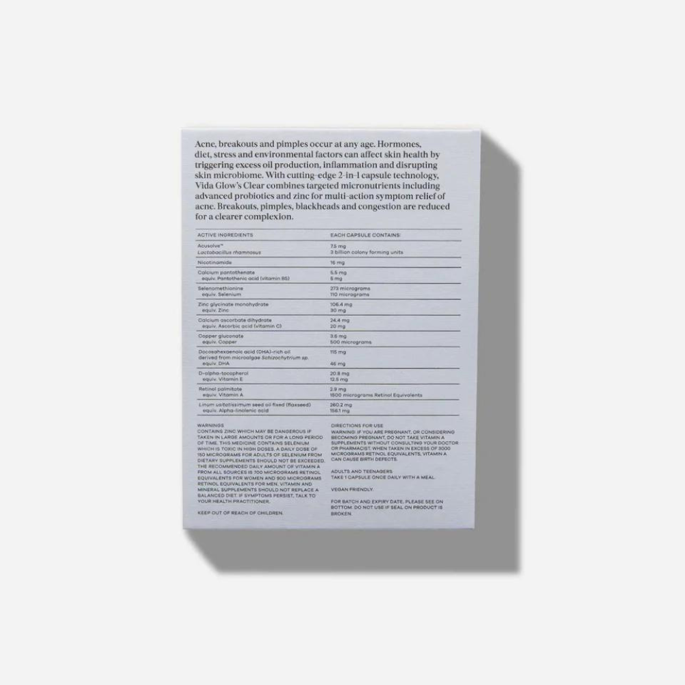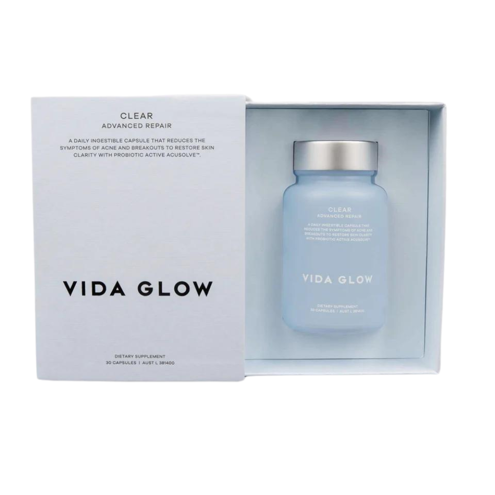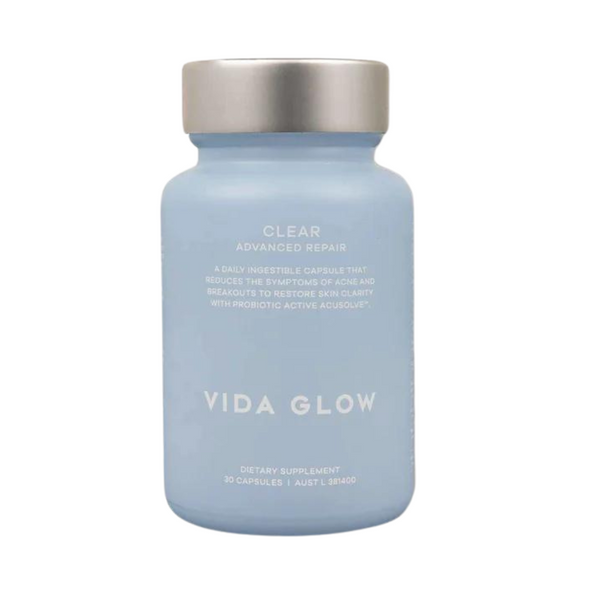 Vida Glow Clear Capsules are a powerful once-daily supplement from the Advanced Repair range, designed to combat acne and breakouts at any age. As part of your daily routine, these capsules target the primary symptoms of acne, including pimples, blackheads, excess oil, and skin inflammation.