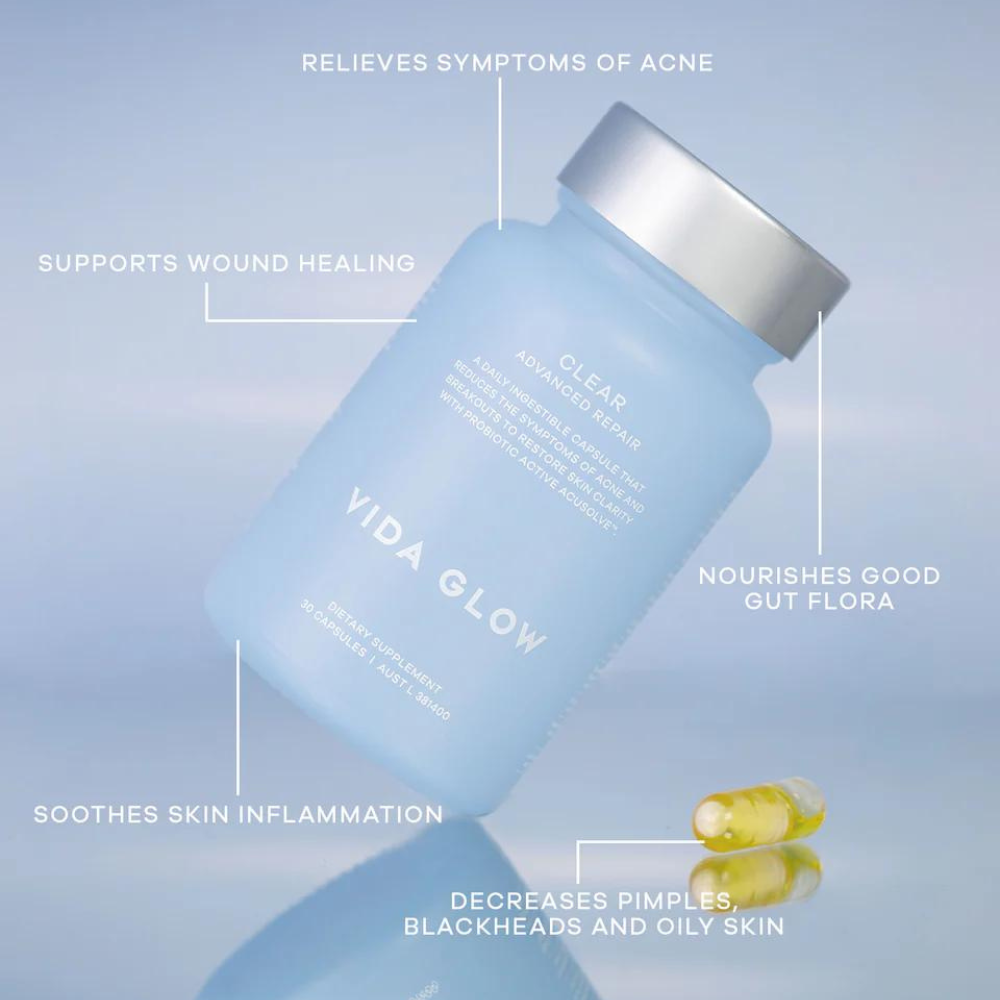 Make Vida Glow Clear Capsules part of your daily beauty ritual for calmer, clarified skin!