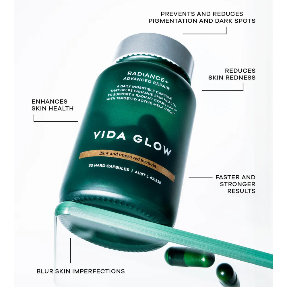 Vida Glow Radiance+ Capsules are a powerful supplement from the Advanced Repair range, reformulated for more potent results. As part of your daily routine, these capsules target stubborn signs of pigmentation, including melasma, sun spots, age spots, dark spots, and skin redness.